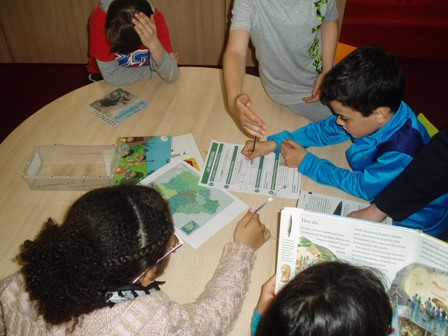 Mediante un juego de pistas, el alumnado descubre los recursos y las secciones de la biblioteca, la organización y las normas básicas